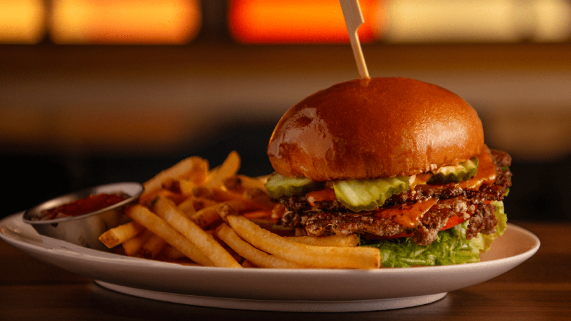 • National Burger: Double beef patties, American cheese, Clive sauce, tomato, lettuce, dill pickle, and your choice of shoestring fries or Caesar salad