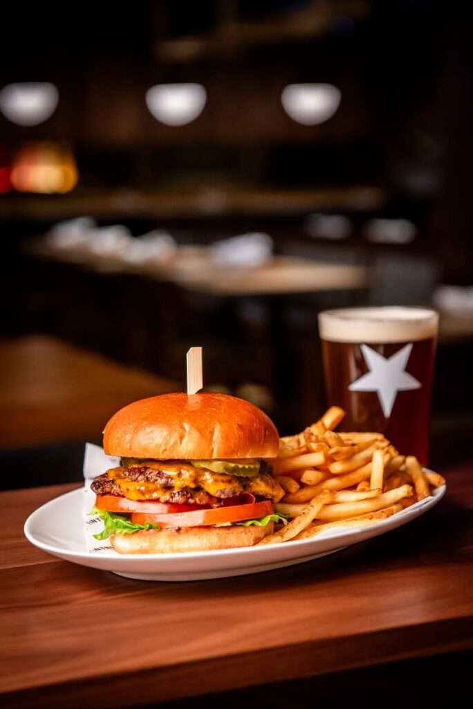 • Dry Aged Beef Burger: Aged cheddar, tomato, pickles, caramelized onion, served with fries