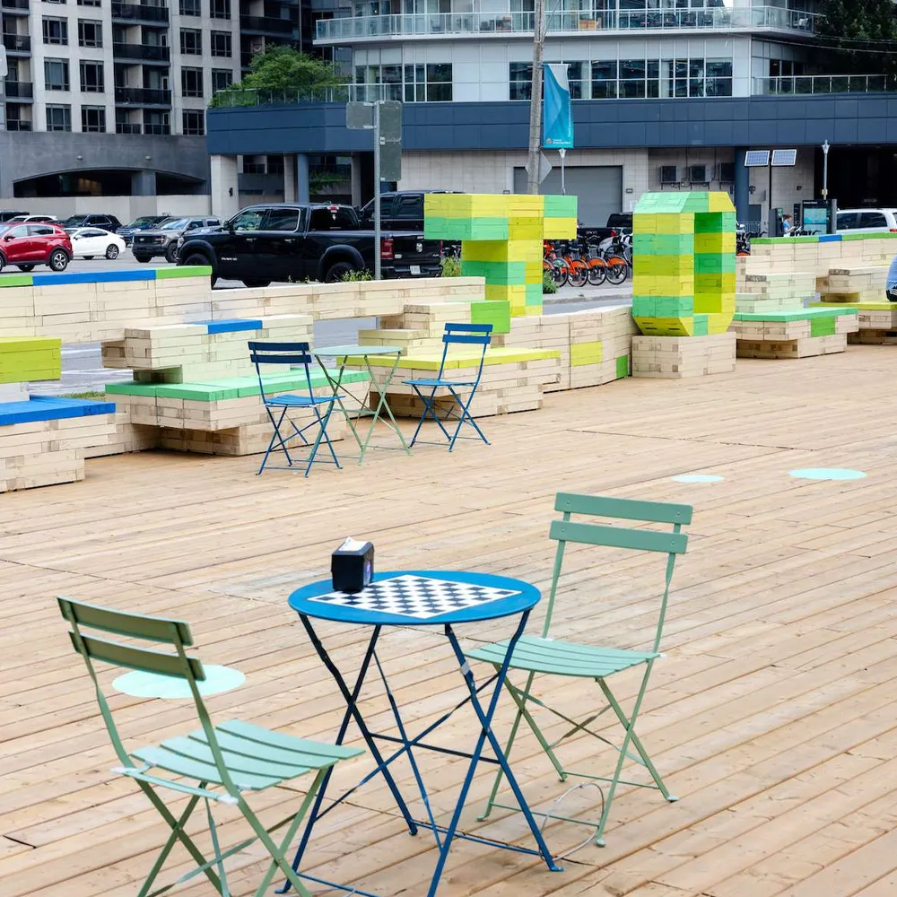 The Deck at Clarence Square reimagined Clarence Square Park as an inviting outdoor gathering space through temporary decking, seating, and an artistic installation that complemented the urban setting. Designed as an “outdoor living room,” the space was activated throughout the summer with live music, community programming, and partnerships with local organizations, including the Summer Music Series, Chess in the Park, Paws in the Park, and opportunities for local businesses to participate.
